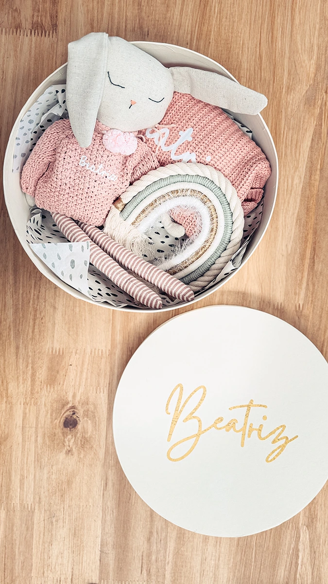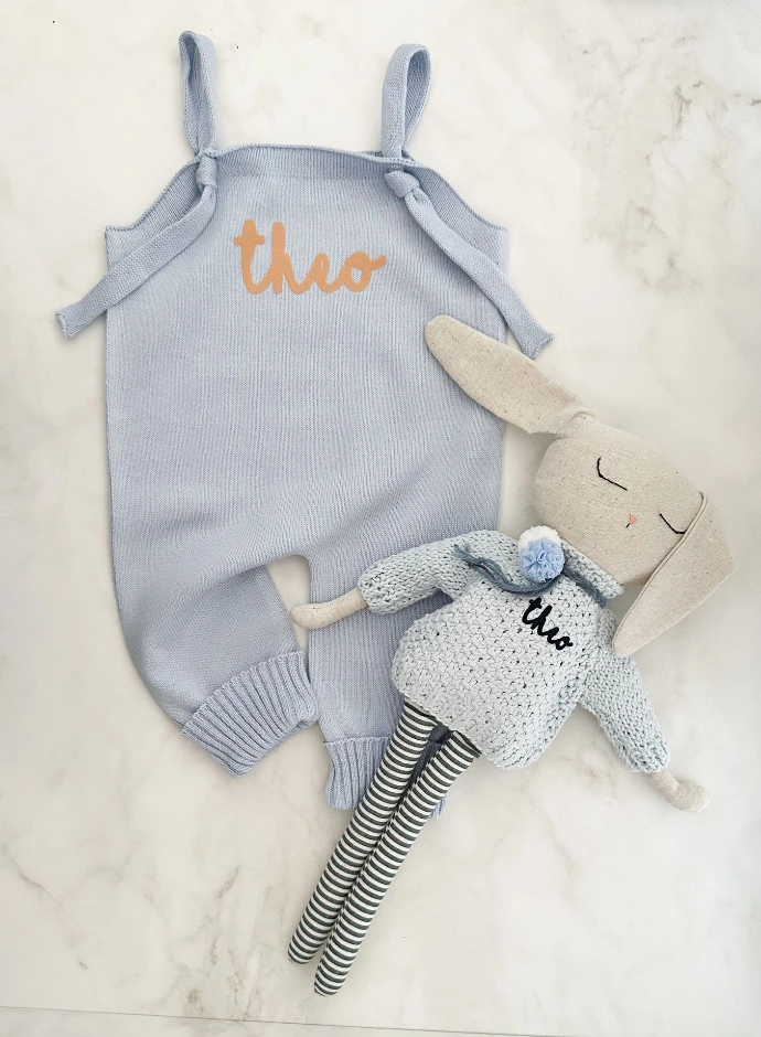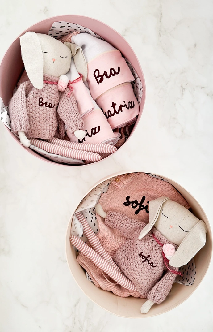Que tal estampar o nome do bebê na malha do coelho e da criança? Vai na minha: o sucesso é garantido! ♥