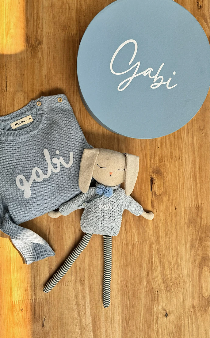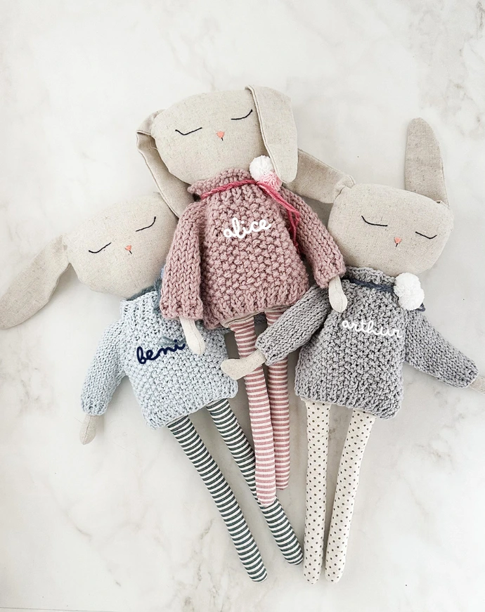 Coelhos costurados à mão artesanalmente, confeccionados em linho. Acompanham malha de tricot, personalizada com o nome, apelido ou palavra desejada.