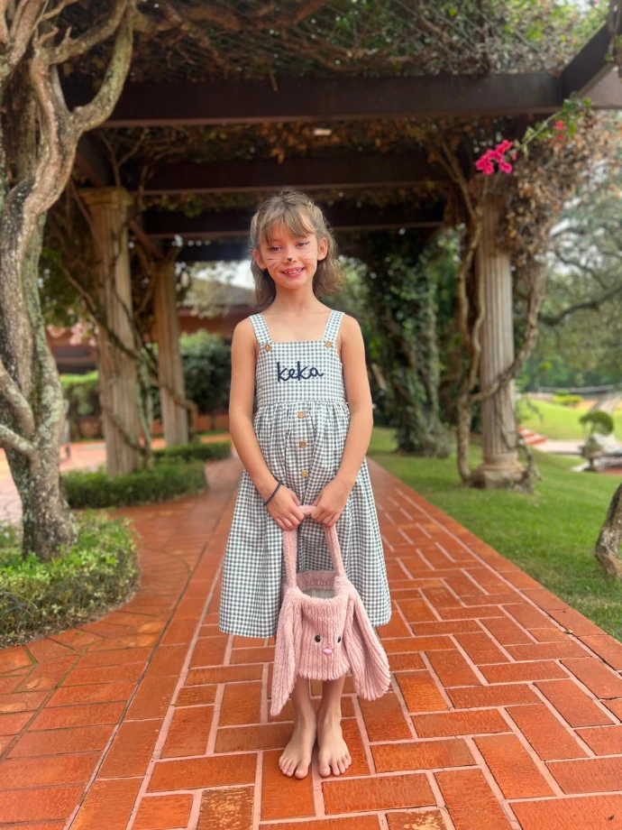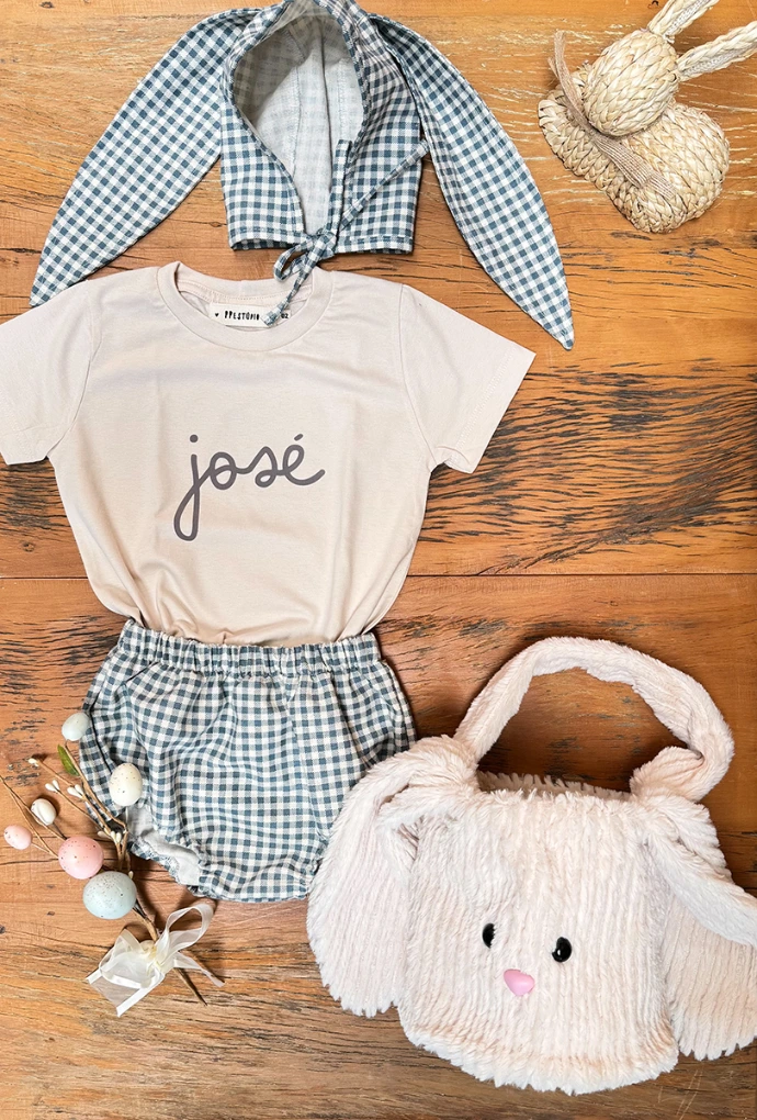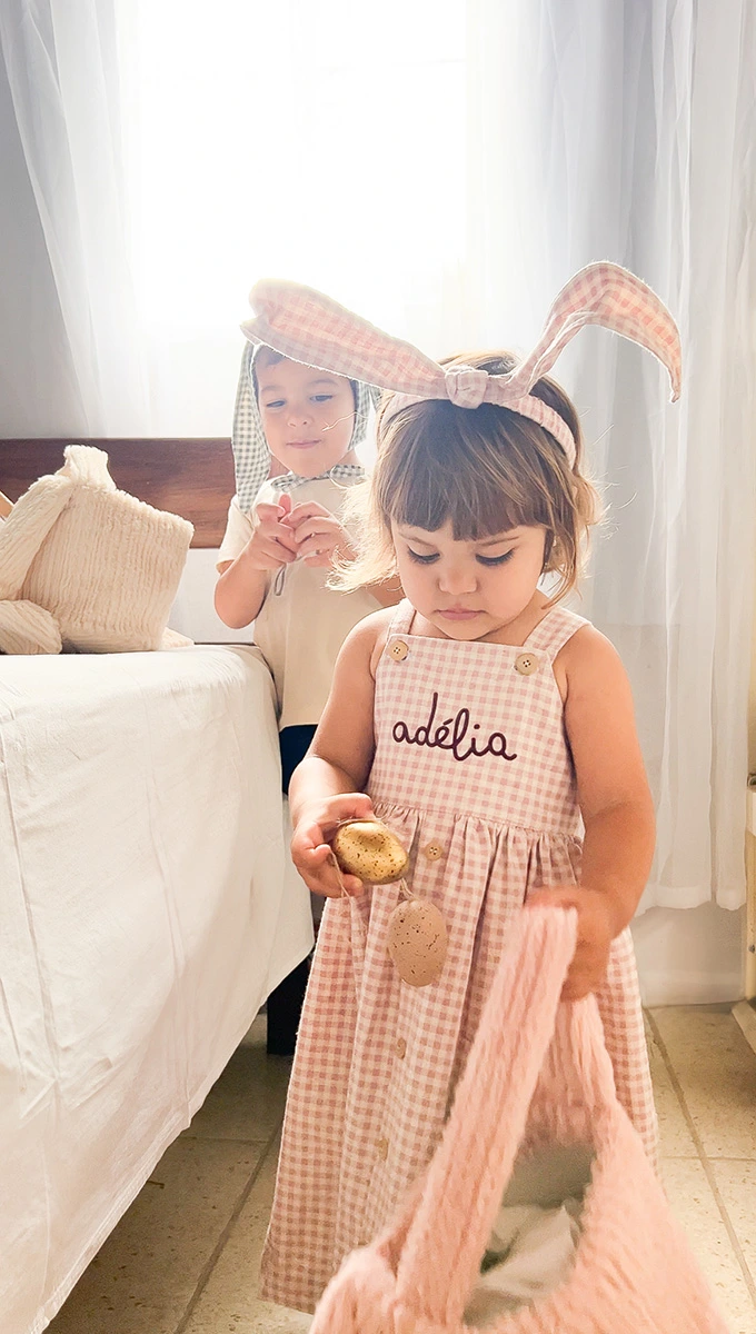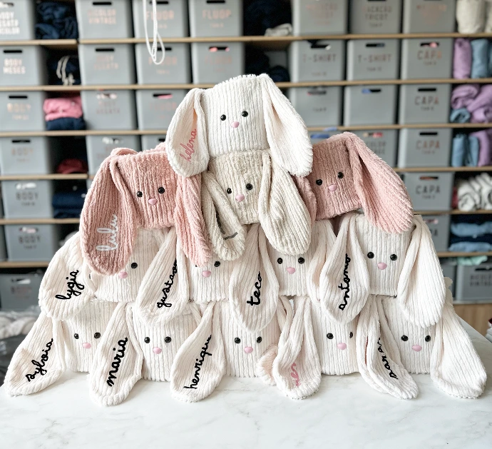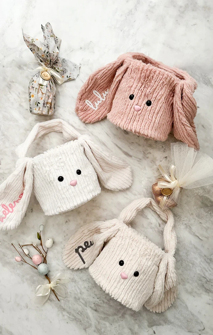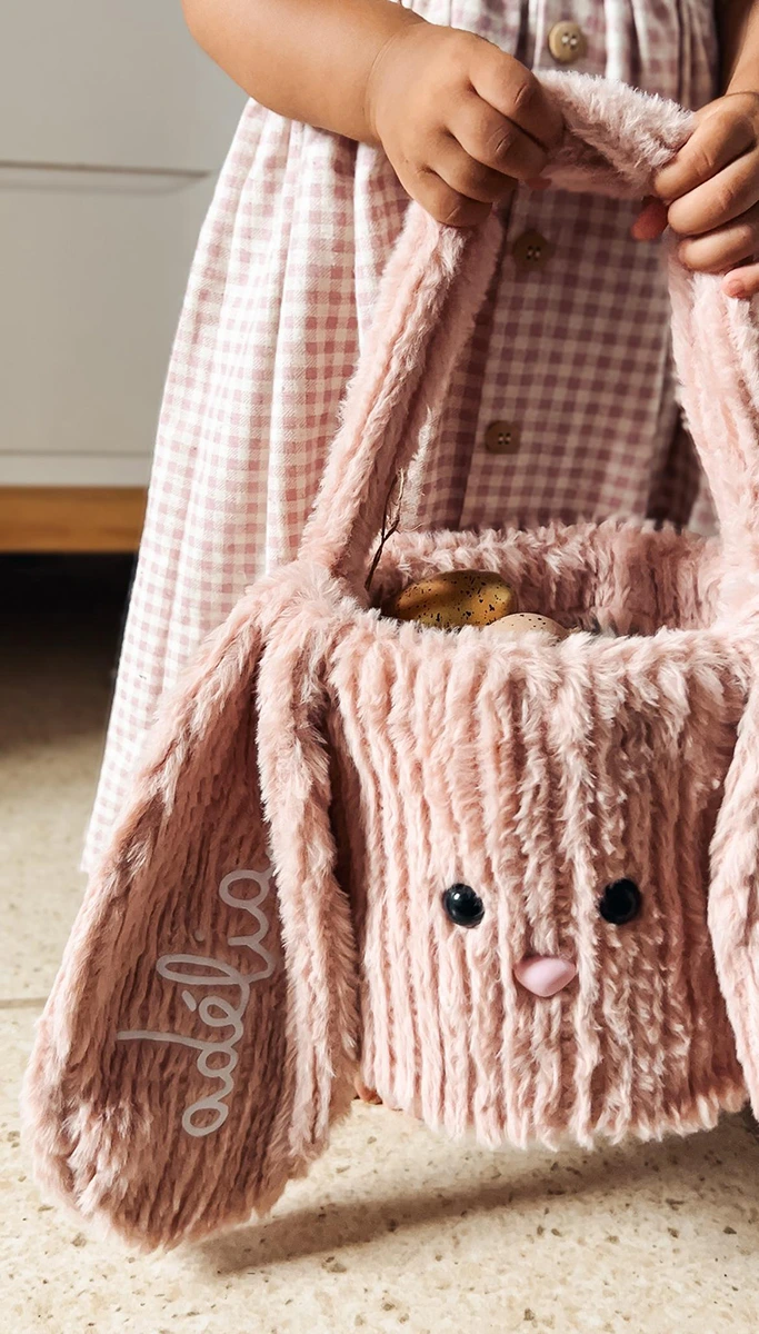 Cesta de Pelúcia com nome da criança estampado na orelha. Perfeito para caça aos ovos!